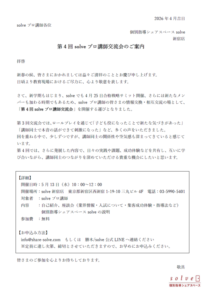 「第4回 Solveプロ講師交流会」を開催いたします。